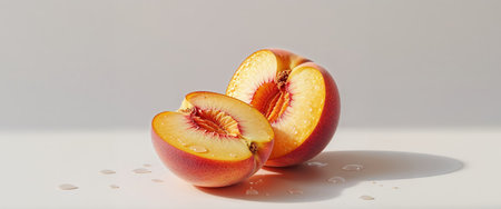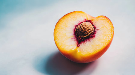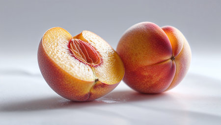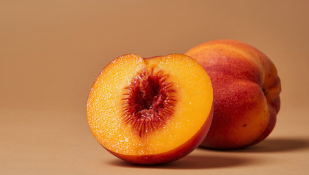 AI Generated. A perfectly cut peach in half displaying its juicy flesh and beautiful color ideal for summer recipes and snacks