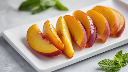 Sliced peaches arranged neatly on a white plate, showcasing their juicy flesh and vibrant color, with a few mint leaves as garnish for a fresh summer feel