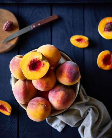 Yellow red peaches on a rustic wooden board