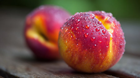 This image features two fresh peaches displayed on a textured wooden surface. The foremost peach is covered in water droplets, highlighting its vibrant red, yellow, and orange tones, creating a visually appealing image.