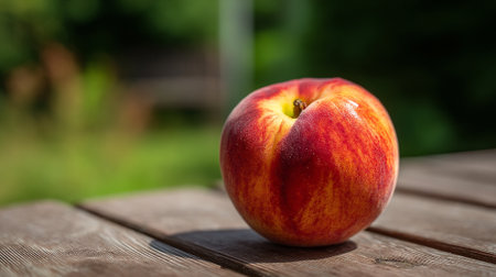 The image captures a single, ripe peach, exhibiting a blend of red and yellow hues, placed on a weathered wooden table. The background features blurred greenery, suggesting an outdoor setting.