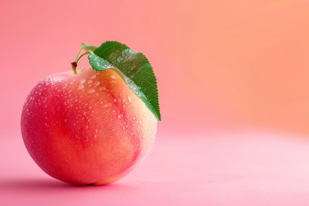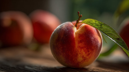 A vibrant peach, adorned with a fresh green leaf, rests gracefully on weathered wood. Soft lighting enhances the fruit's colors and texture, evoking a feeling of summer freshness and natural sweetness.