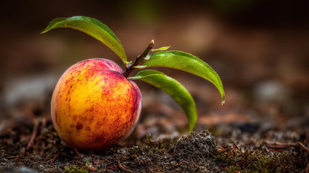 This photograph presents a vibrant peach, displaying a rich blend of yellow and red hues. It is positioned naturally among foliage and soil, enhanced with depth through selective focus and lighting.