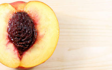 Ripe nectarine on a yellow background, space for text.
