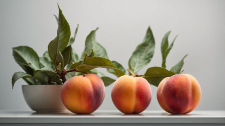 AI Generated. Three Peaches with Green Leaves on a White Shelf