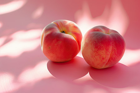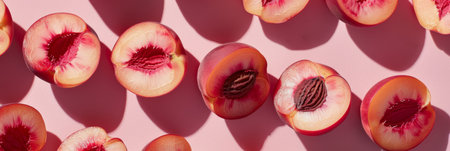 Halved Nectarines Basking in Sunlight on a Pastel Pink Surface.
