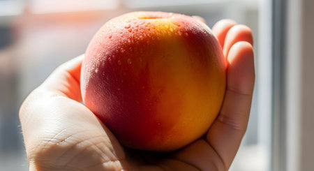 A person's hand holds a fresh, ripe peach with water droplets on its fuzzy skin, illuminated by natural sunlight. The blurred background suggests a window setting, highlighting the fruit's freshness.