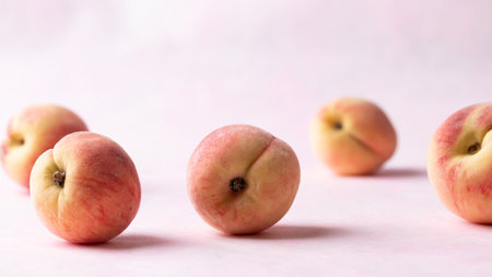 Fresh peaches on pink background, Summer fruit
