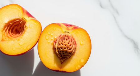 Close-up of halved fresh nectarine on white marble surface