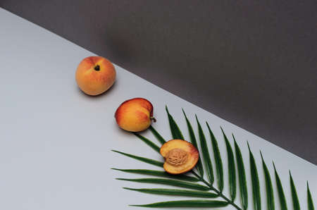 Summer scene with peach, nectarines, palm leaf on white and dark grey background. Summertime concept. Card with copy space