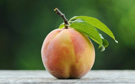 apricot fruit sits delicately on a rustic wooden table, its vibrant orange skin glistening with subtle sheen, surrounded by lush green leaves and a sprinkle of warm sunlight, evoking feelings of simplicity and natural elegance in this minimalist still life photography. ai generated