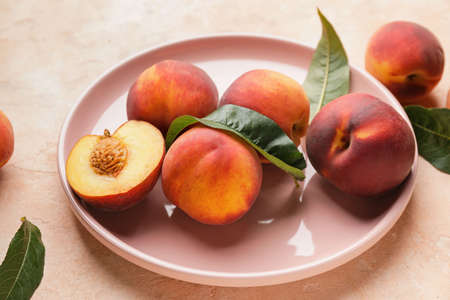 Plate with ripe peaches on color background