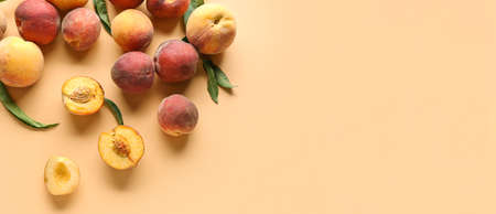 Fresh peaches on beige background with space for text