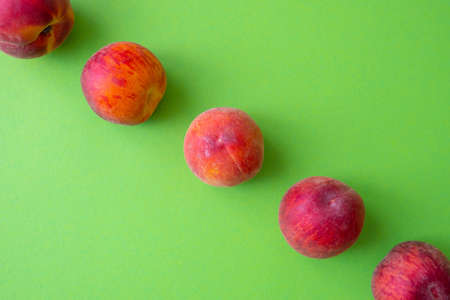 ripe peaches laid out in a line, dividing the green background in half, close-up