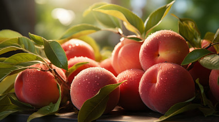 A group of peaches with leaves close-up. Generative AI.