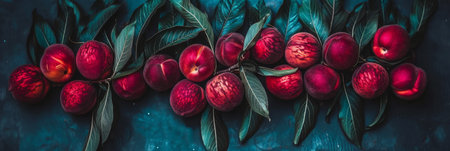 Fresh peaches on a blue background. top view
