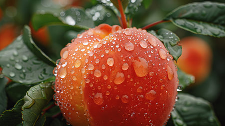 Close up micro shot of fresh peach with water drops on tree, wide banner with copy space