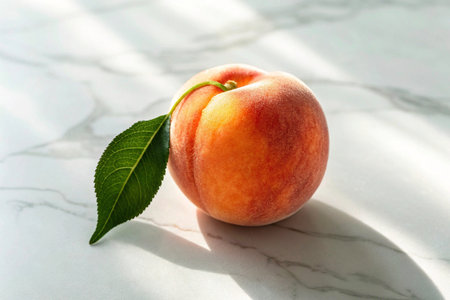 Ripe peach with green leaf on white marble table, closeup