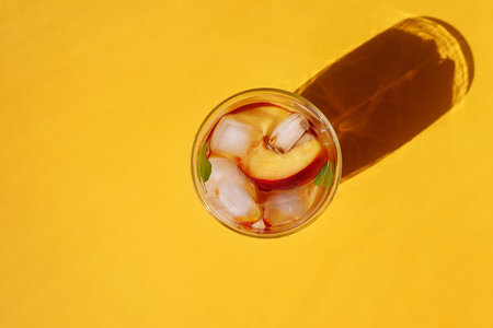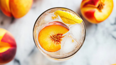 Refreshing summer drink with ice and peaches, top view