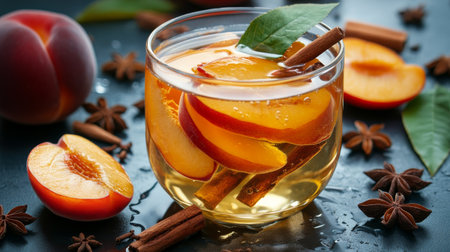 AI Generated. refreshing peach iced tea with fresh fruit slices and thyme