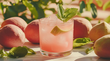 A vibrant pink cocktail garnished with fresh mint and lime, surrounded by peaches. Perfect for summer parties and refreshing gatherings. Enjoy this delightful drink!