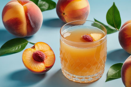 Diet and nutrition concept. Freshly squeezed organic peach juice in glass and fresh fruits with leaves on light blue background. Healthy lifestyle, vegan concept. Spring summer beverage.