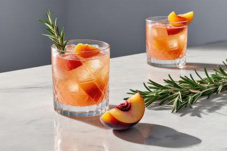 Summer refreshing soda drink or alcoholic cocktail with ice, rosemary and peach on a white marble table. Fresh healthy cold beverage 2024. Trendy soft colors, pastel tones.