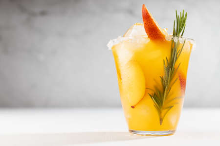 Fresh cold peach drink in glass with ice cubes, green rosemary, fruit slice, sugar rim in soft light white kitchen interior.