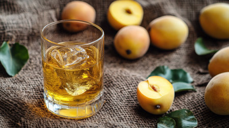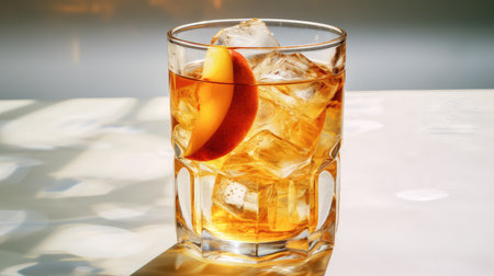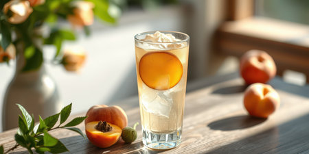 Refreshing summer drink with peach slices on a wooden table bathed in natural light
