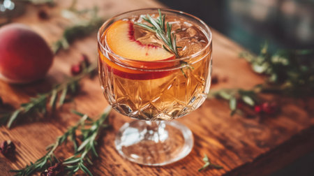 A fresh peach and rosemary mocktail in a crystal glass, with peach slices floating in a golden liquid, placed on a wooden table with scattered herbs.