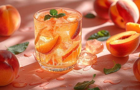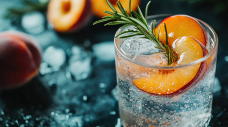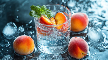 A sparkling glass of refreshing water with peach slices and ice cubes creates a delightful visual. Perfect for summer gatherings, this drink captures hydration and flavor.