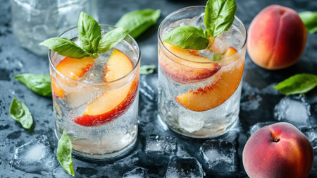 A vibrant and refreshing drink featuring fresh peach slices and basil leaves over ice, perfect for summer gatherings or a relaxing afternoon.