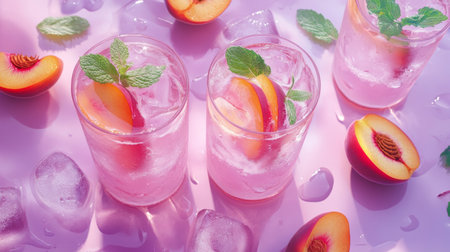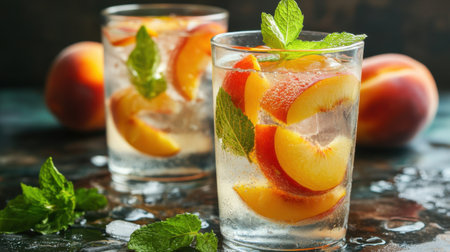 Refreshing iced drinks with peach slices and mint leaves generative ai