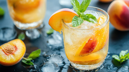 A refreshing summer drink featuring vibrant peach slices and fresh mint served over ice. Perfect for outdoor gatherings or relaxed lounging.