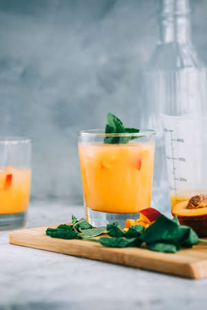 Ice lemonade in glass with peach pieces, fresh mint and ice cubes on the table