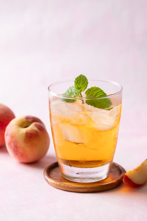 Iced peach tea with mint leaf in glass and fresh peaches on pink background, Summer drink
