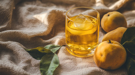 A golden glass of quince liquor resting on a soft canvas fabric, with fresh quince fruits artfully arranged nearby, evoking the sweet and natural flavors of the drink