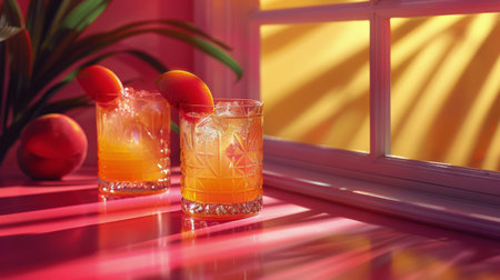 Two glasses are filled with ice cubes and slices of colorful fruit, creating a refreshing and vibrant drink on a table.