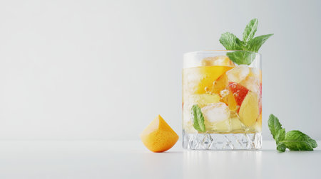 A stylish cocktail garnished with colorful fruit and mint leaves, served over ice cubes in an elegant glass, all against a clean white backdrop to emphasize the drink's freshness.