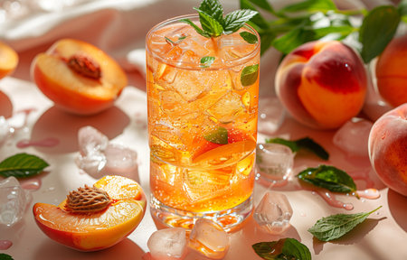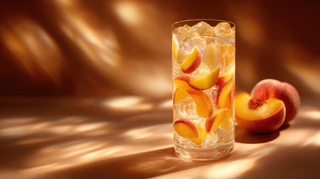 A tall glass filled with ice and peach slices, illuminated by warm lighting, showcasing a refreshing summer drink perfect for cooling off during hot days.