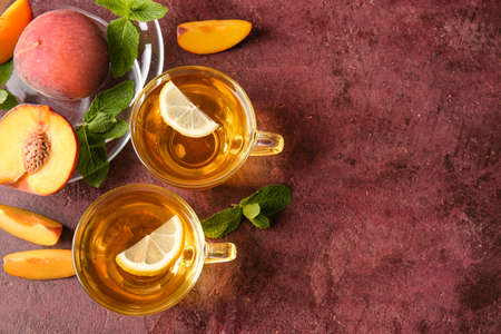 Cups of hot tea and ripe peaches on grunge background