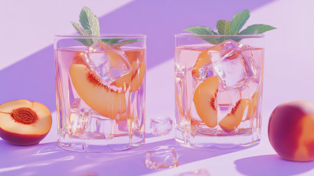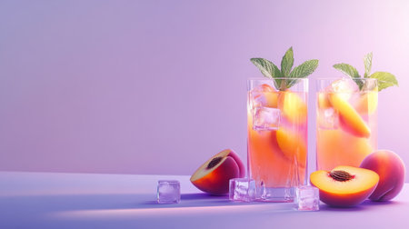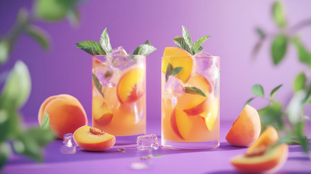 Two cool drinks with peach slices and mint leaves, pastel purple surface. generative ai