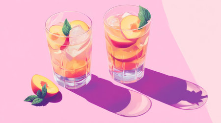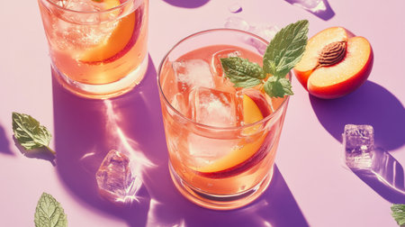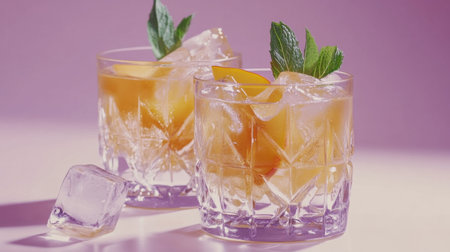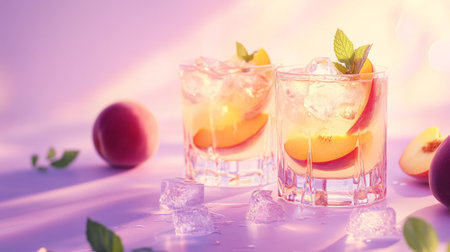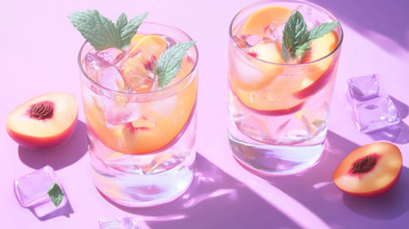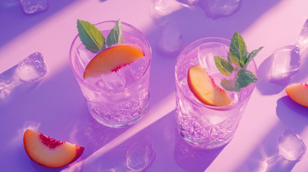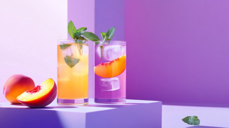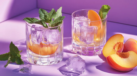 Two glasses with peach and mint infused cocktails on a lavender surface. generative ai