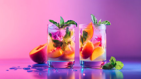 Two vibrant summer drinks with floating mint and peach. generative ai