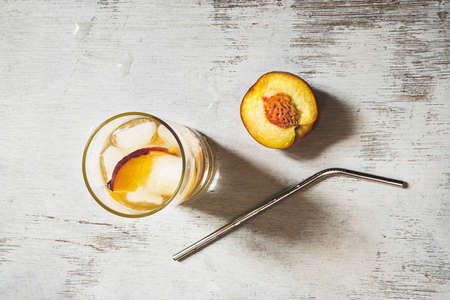 Peach refreshing beverage with ice, a half of fresh peach and metal straw for drinks on an old white wooden table, top view