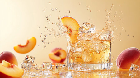 Refreshing scene of fresh peach slices submerged in sparkling water with ice cubes, perfect for summer drinks and healthy refreshments. Inviting and vibrant.