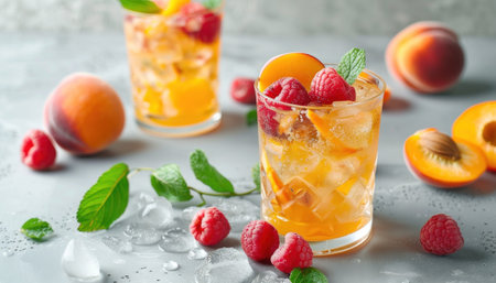 Two glasses of refreshing peach iced tea with raspberries and mint on a gray background