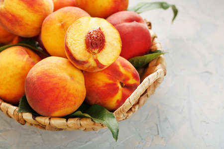 Ripe peaches in a wicker basket on a stone gray table with a juicy peach slice with a stone pit. Top view, free space
