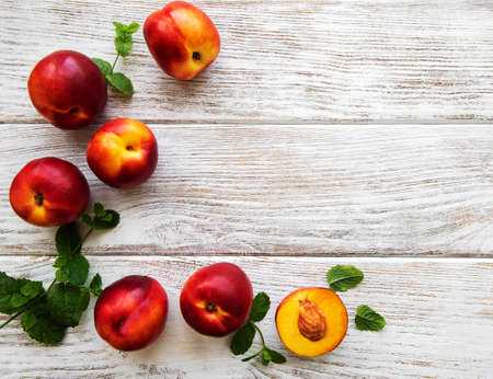 Fresh nectarines on a white wooden table