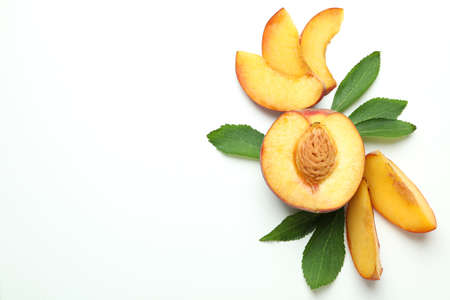 Ripe peach fruit with leaves on white background